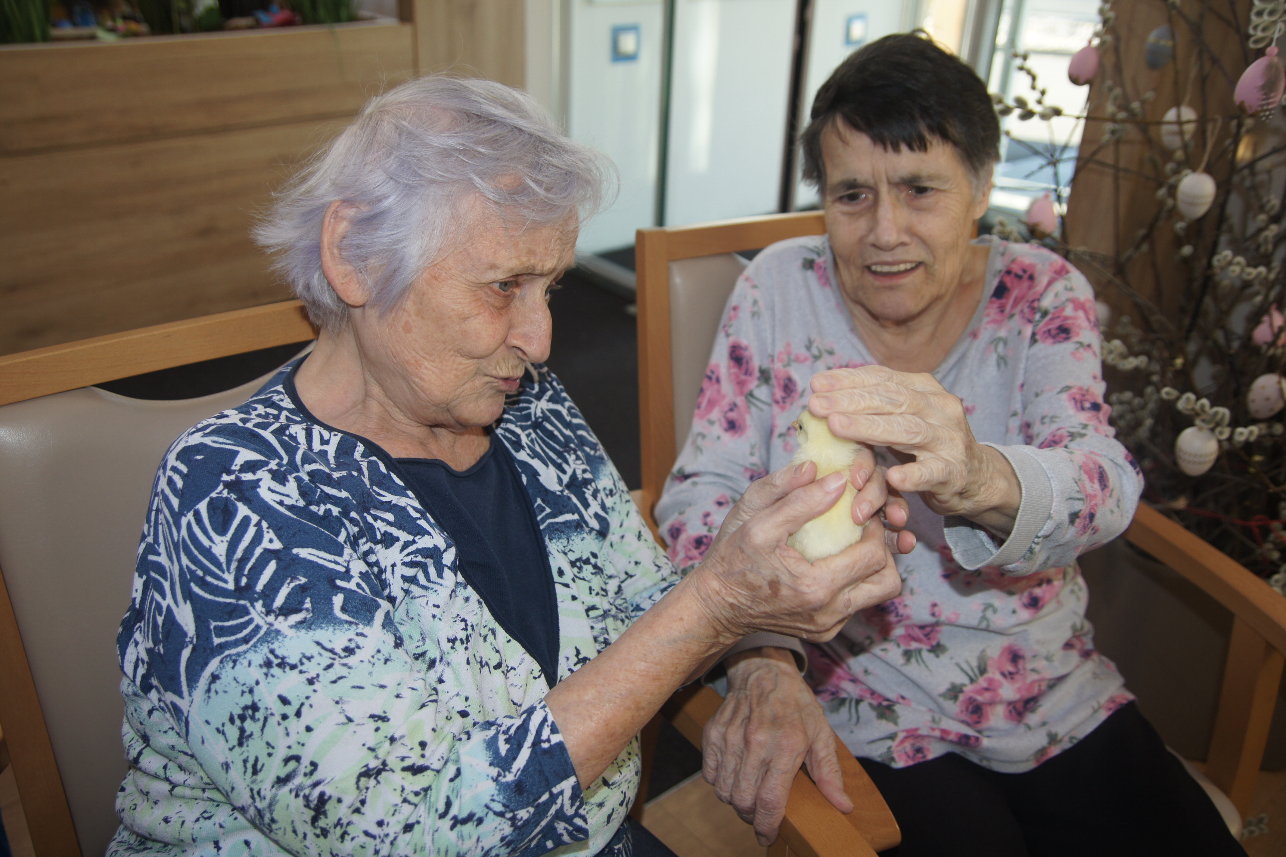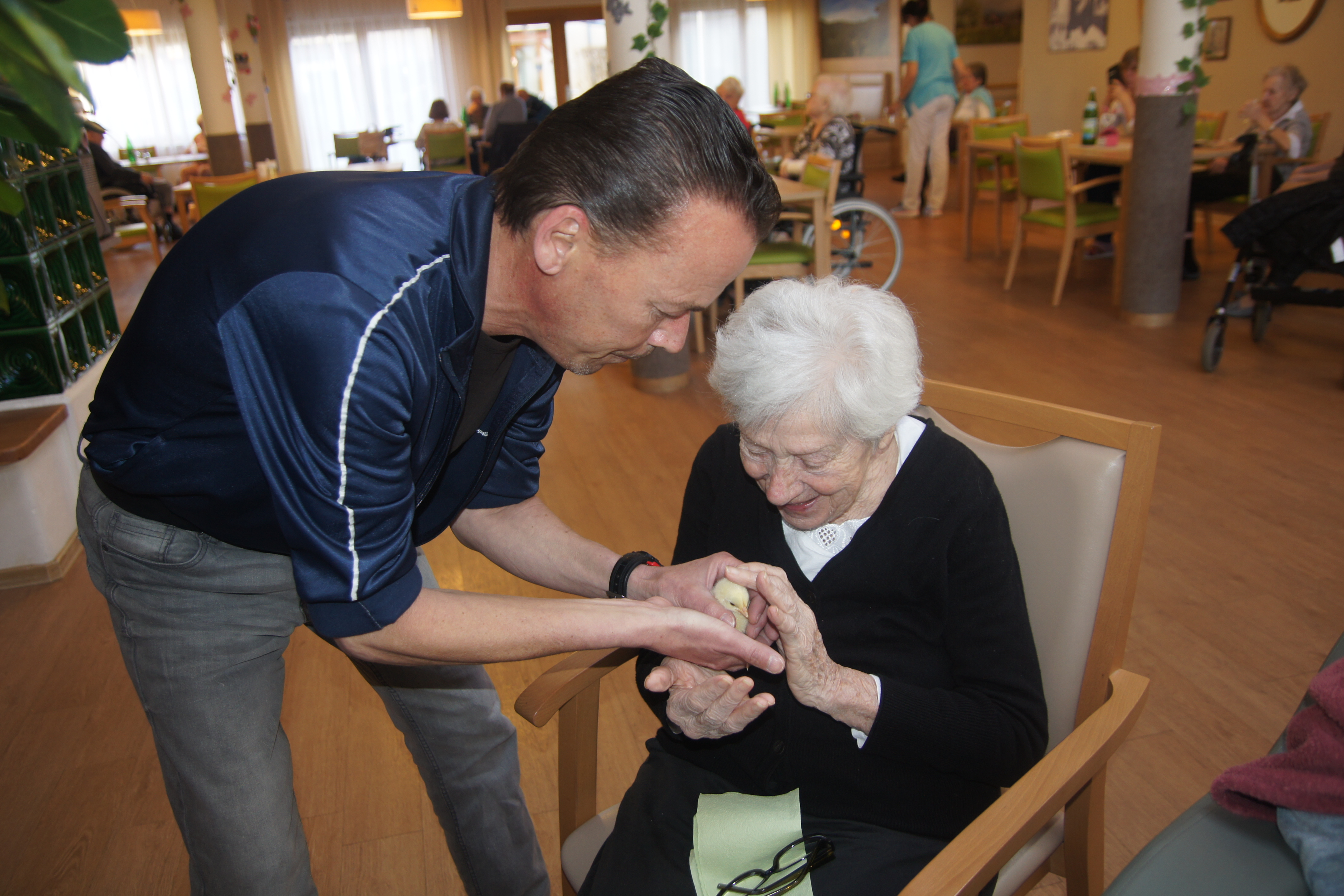 Im SeneCura Pflegezentrum Graz in der Peter-Rosegger-Straße gibt es seit kurzem flauschigen Zuwachs. Kleine Küken sind das neue Highlight für Bewohner:innen, Angehörige und Mitarbeiter:innen. Bewohner Herr Thausz schwärmt: „Das sind unsere neuen Babys, ich bin jetzt Babysitter. Sie sind so süß. Man könnte ihnen stundenlang zusehen.“. Die kleinen flauschigen Mitbewohner:innen werden gestreichelt, herumgetragen und liebevoll gepflegt. Die Freude bei allen ist riesig.