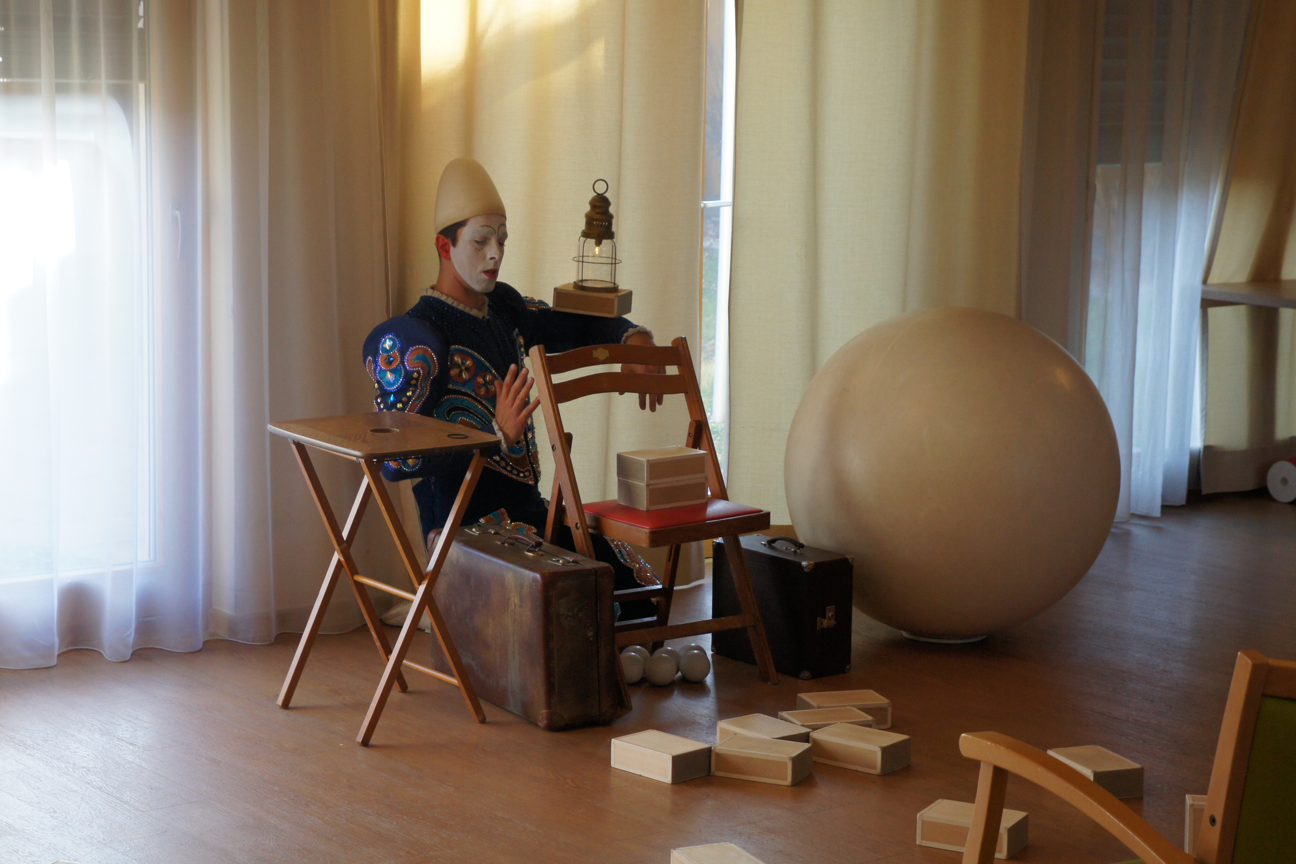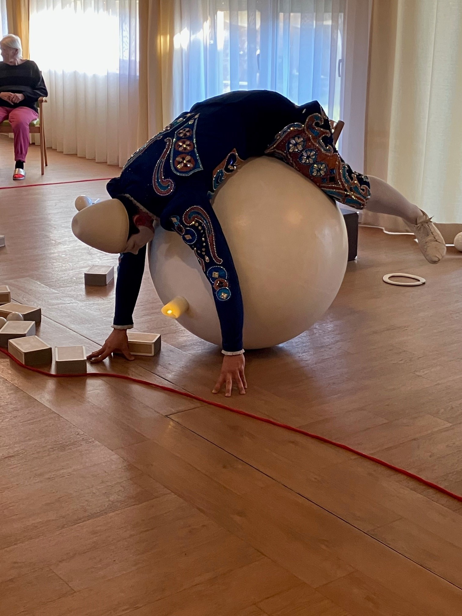 Ganz still wurde es, als der Weißclown Pierre Roman die BewohnerInnen auf eine Reise durch das Leben mitnahm. Der Weißclown trug ein dunkelblaues Kostüm mit glänzenden Verzierungen, eine typisch bis zu den Knien reichende Pumphose, elegante Seidenstrümpfe, weiße Schuhe und eine kegelförmige Kopfbedeckung. Sein Gesicht war weiß, seine faszinierende Jonglage eine große Freude für die ZuseherInnen. Sie spendeten nach der einstündigen Vorstellung frenetischen Applaus. Mit Pierre Roman und dem Wal am Strand erweckte Ralph Öllinger eine bekannte Zirkusfigur aus vergangener Zeit wieder zum Leben. Diese Figur hat Besonders in Pflegeheimen einen hohen Wiedererkennungswert.